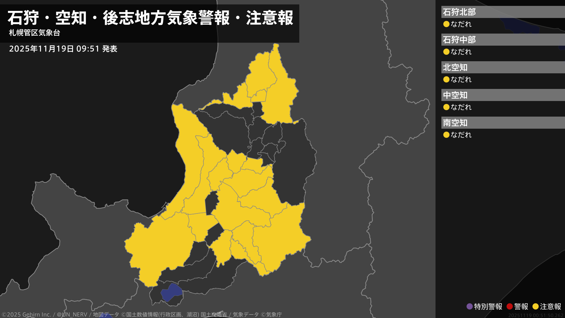 【石狩・空知・後志地方 気象警報・注意報 2025年11月19日 09:51】石狩、空知地方では、19日までなだれに注意してください。#気象警報注意報 #石狩地方 #空知地方