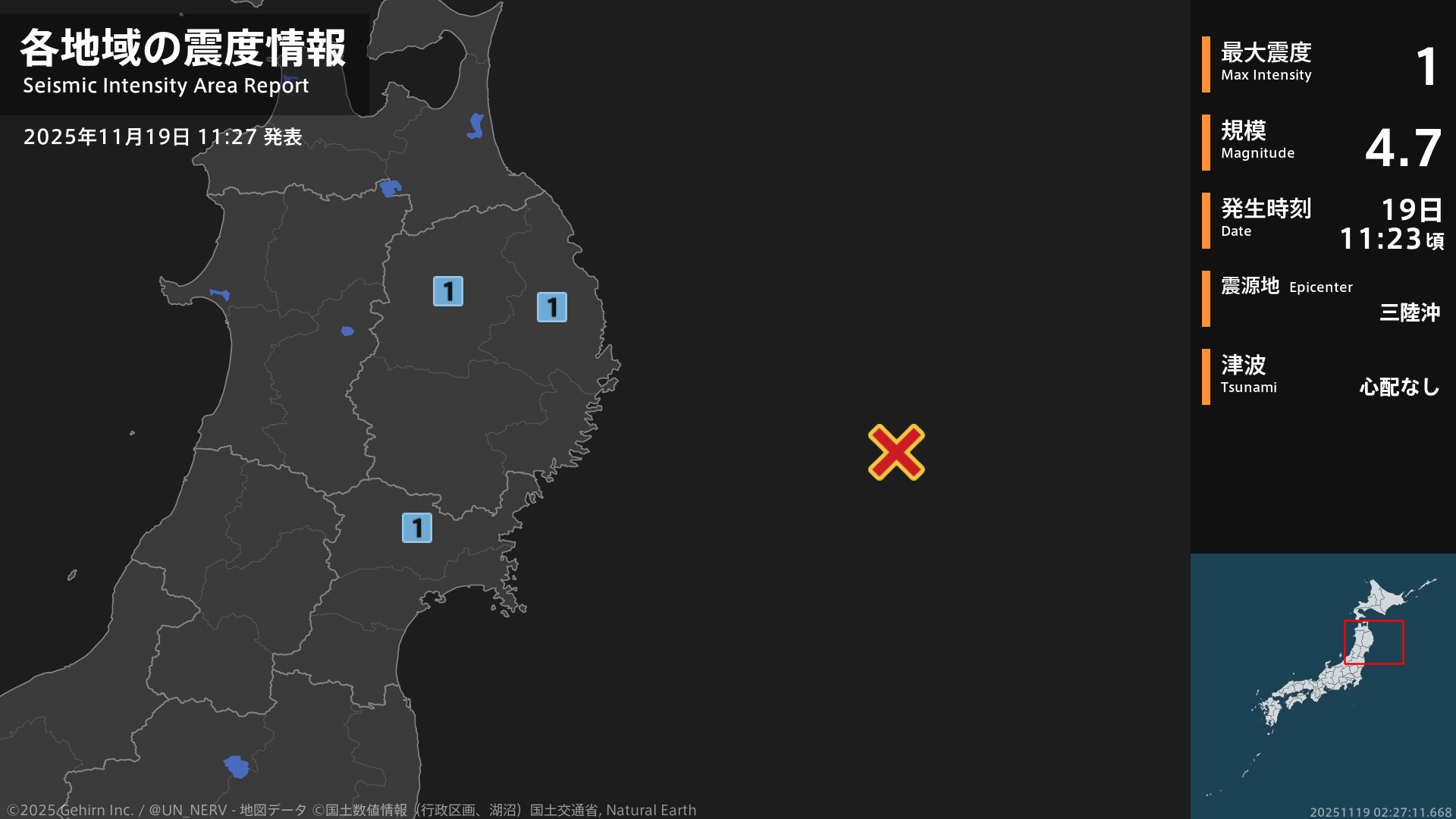 【地震情報 2025年11月19日】11時23分頃、三陸沖を震源とする地震がありました。震源の深さは約10km、地震の規模はM4.7、最大震度1を岩手県、宮城県で観測しています。この地震による津波の心配はありません。#地震 #岩手県 #宮城県