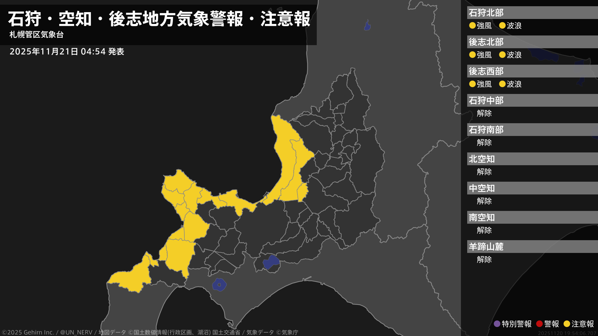 【石狩・空知・後志地方 気象警報・注意報 2025年11月21日 04:54】石狩、後志地方では、強風や高波に注意してください。#気象警報注意報 #石狩地方 #空知地方 #後志地方