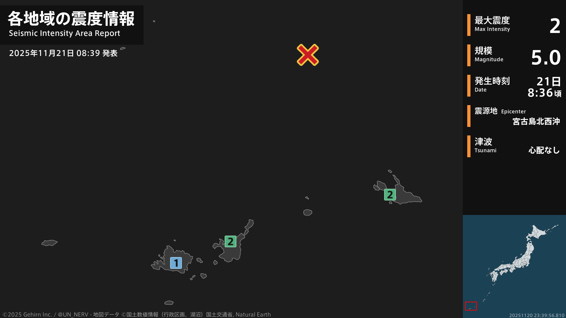8時36分頃、宮古島北西沖を震源とする地震がありました。震源の深さは約110km、地震の規模はM5.0、最大震度2を沖縄県で観測しています。この地震による津波の心配はありません。