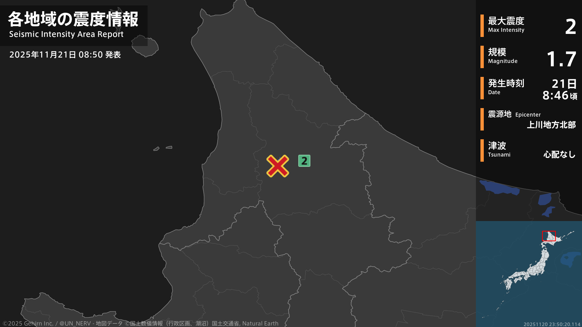 8時46分頃、上川地方北部を震源とする地震がありました。震源の深さは約10km、地震の規模はM1.7、最大震度2を北海道で観測しています。この地震による津波の心配はありません。