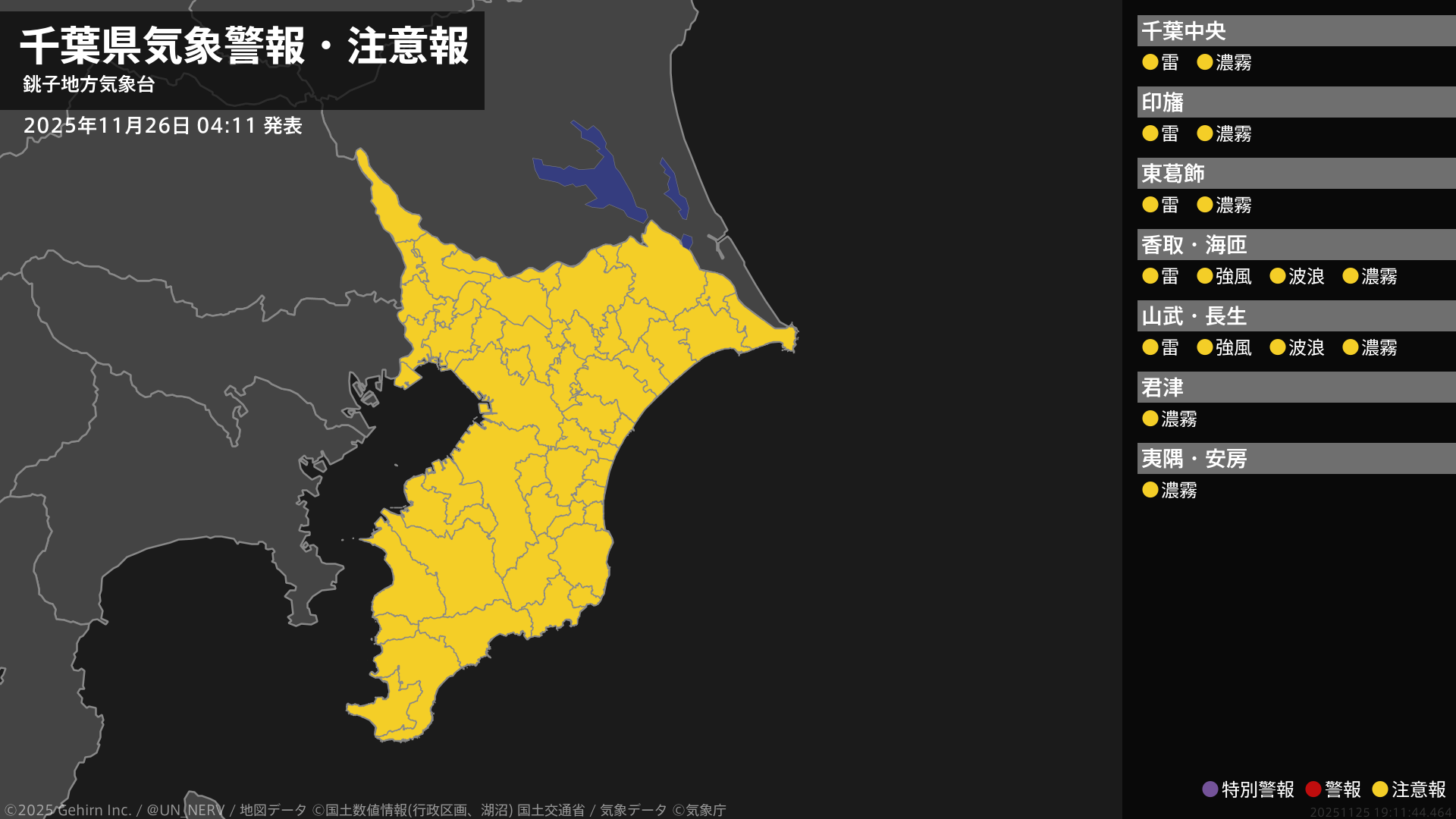 【千葉県 気象警報・注意報 2025年11月26日 04:11】北東部では、強風や高波に注意してください。北西部、北東部では、急な強い雨や落雷に注意してください。千葉県では、濃霧による視程障害に注意してください。#気象警報注意報 #千葉県