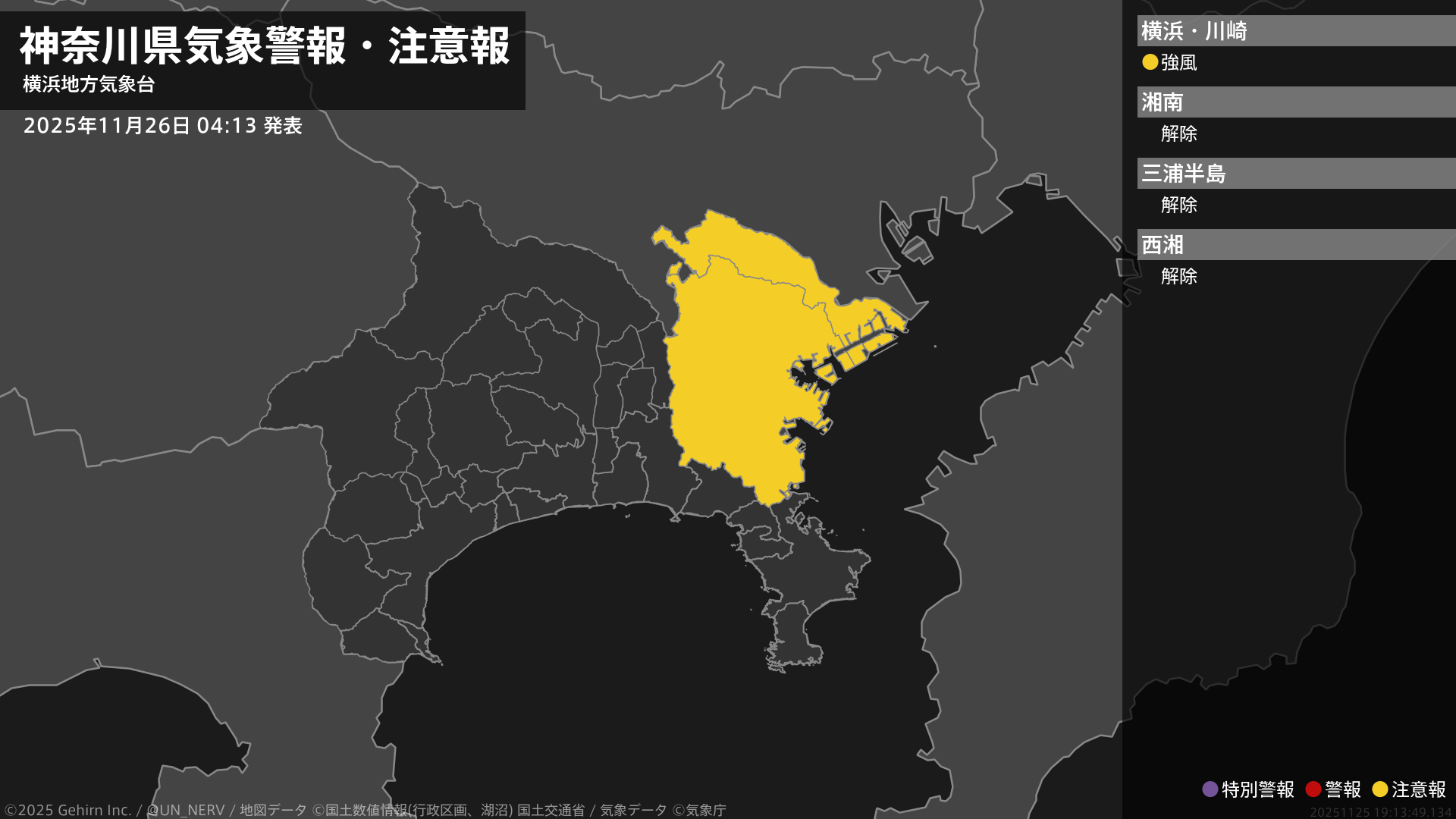 【神奈川県 気象警報・注意報 2025年11月26日 04:13】東部では、26日昼過ぎから26日夕方まで強風に注意してください。#気象警報注意報 #神奈川県