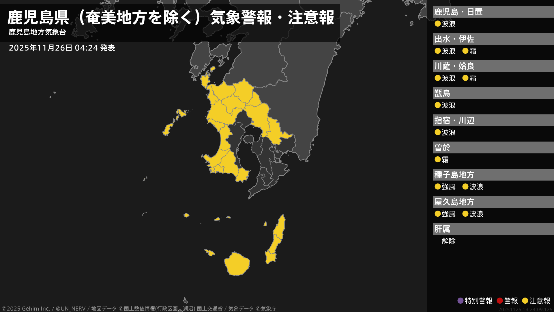 【鹿児島県(奄美地方を除く) 気象警報・注意報 2025年11月26日 04:24】種子島・屋久島地方では、強風に注意してください。薩摩、種子島・屋久島地方では、高波に注意してください。薩摩、大隅地方では、霜に対する農作物の管理に注意してください。#気象警報注意報 #鹿児島県(奄美地方除く)