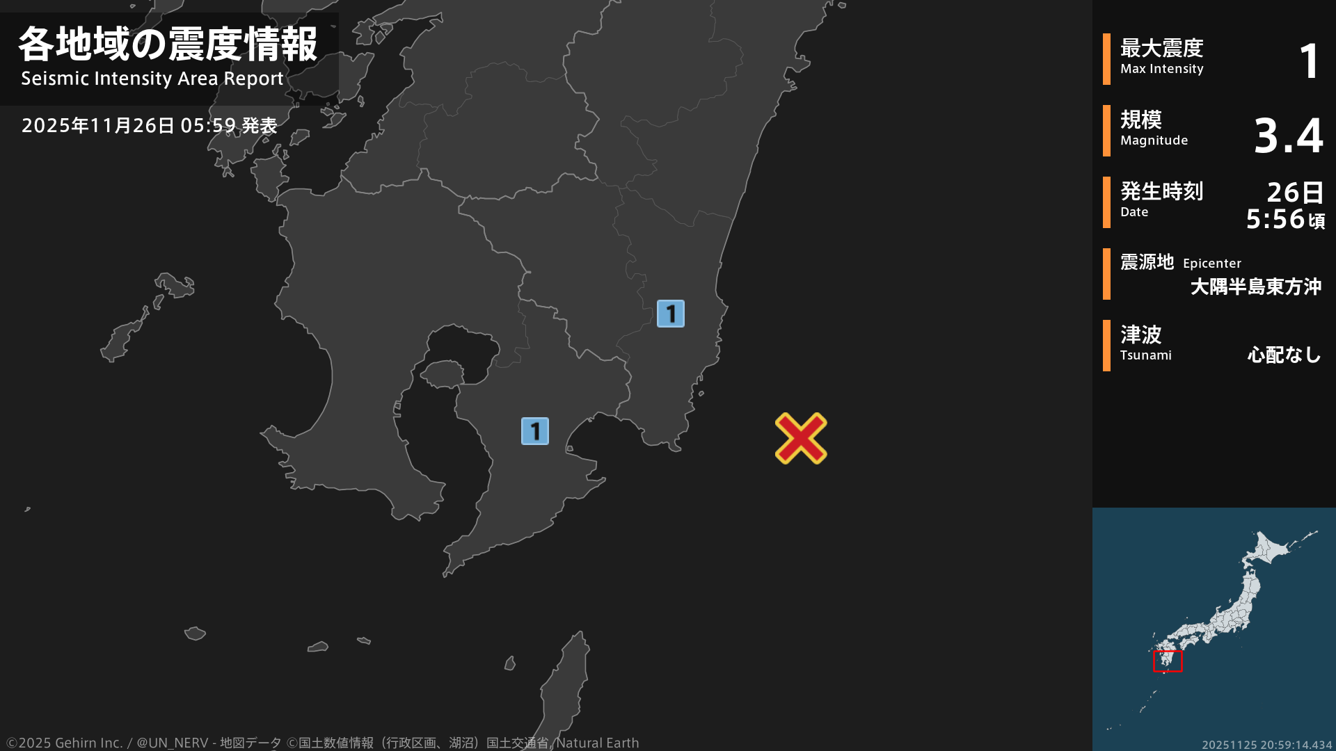 【地震情報 2025年11月26日】5時56分頃、大隅半島東方沖を震源とする地震がありました。震源の深さは約40km、地震の規模はM3.4、最大震度1を宮崎県、鹿児島県で観測しています。この地震による津波の心配はありません。#地震 #宮崎県 #鹿児島県