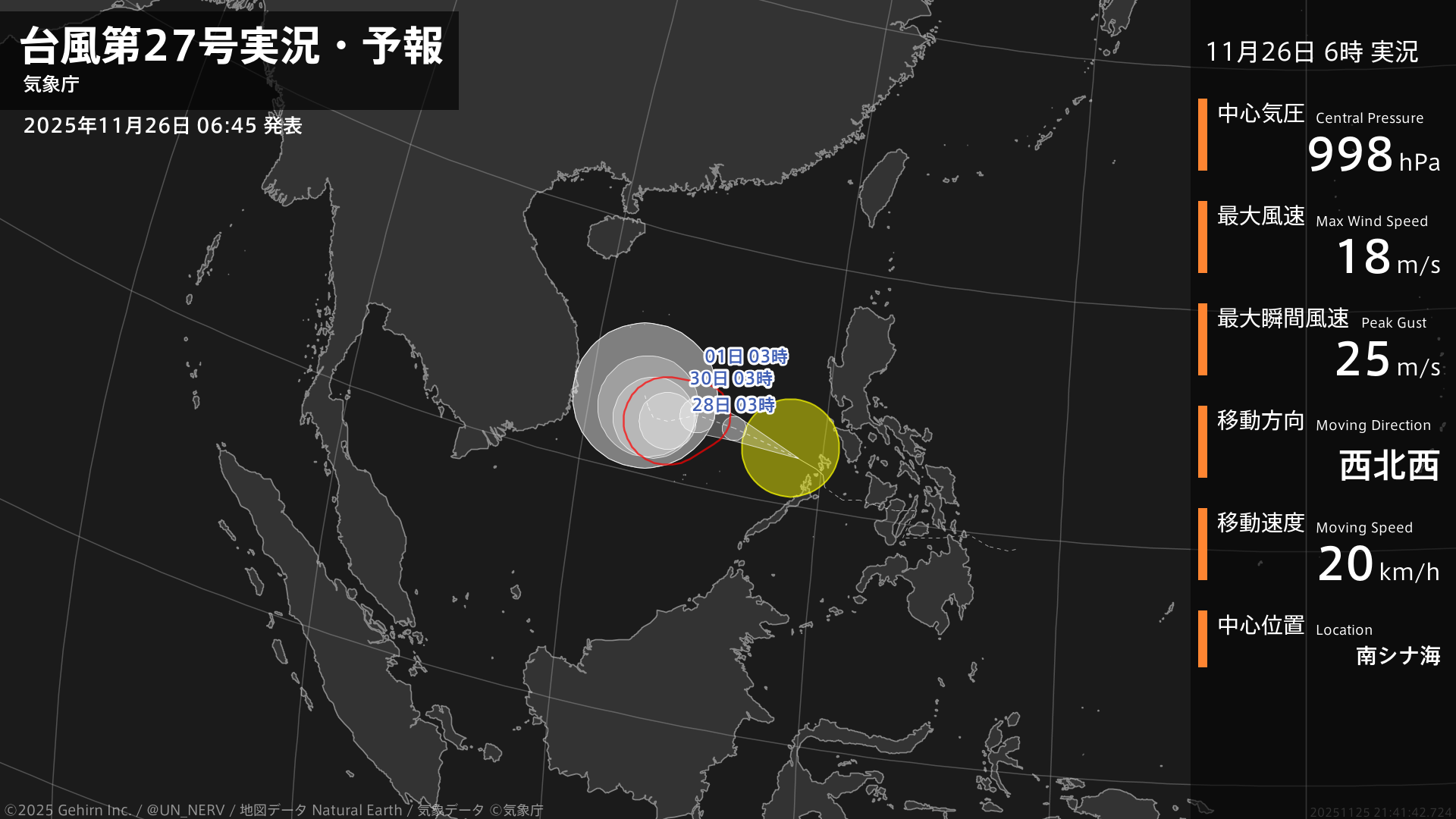 【台風第27号実況・予報 2025年11月26日 06:41】台風第27号(コト)は、南シナ海を1時間に20キロの速さで西北西に進んでいます。#台風情報
