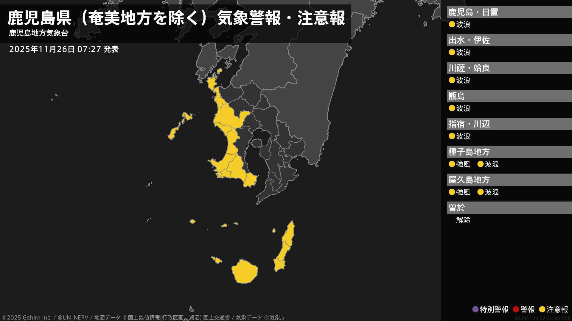 【鹿児島県(奄美地方を除く) 気象警報・注意報 2025年11月26日 07:27】種子島・屋久島地方では、26日昼前まで強風に注意してください。薩摩、種子島・屋久島地方では、26日昼前まで高波に注意してください。#気象警報注意報 #鹿児島県(奄美地方除く)