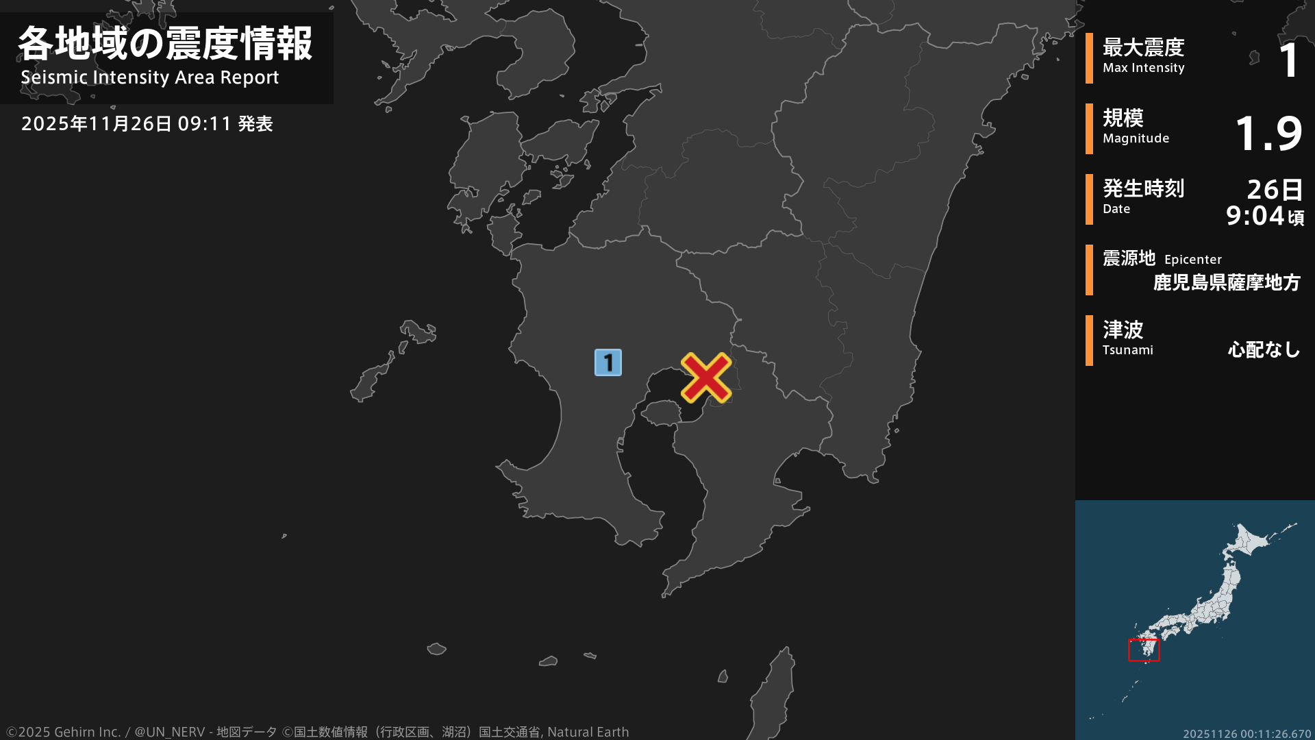 【地震情報 2025年11月26日】9時4分頃、鹿児島県薩摩地方を震源とする地震がありました。震源の深さは約10km、地震の規模はM1.9、最大震度1を鹿児島県で観測しています。この地震による津波の心配はありません。#地震 #鹿児島県