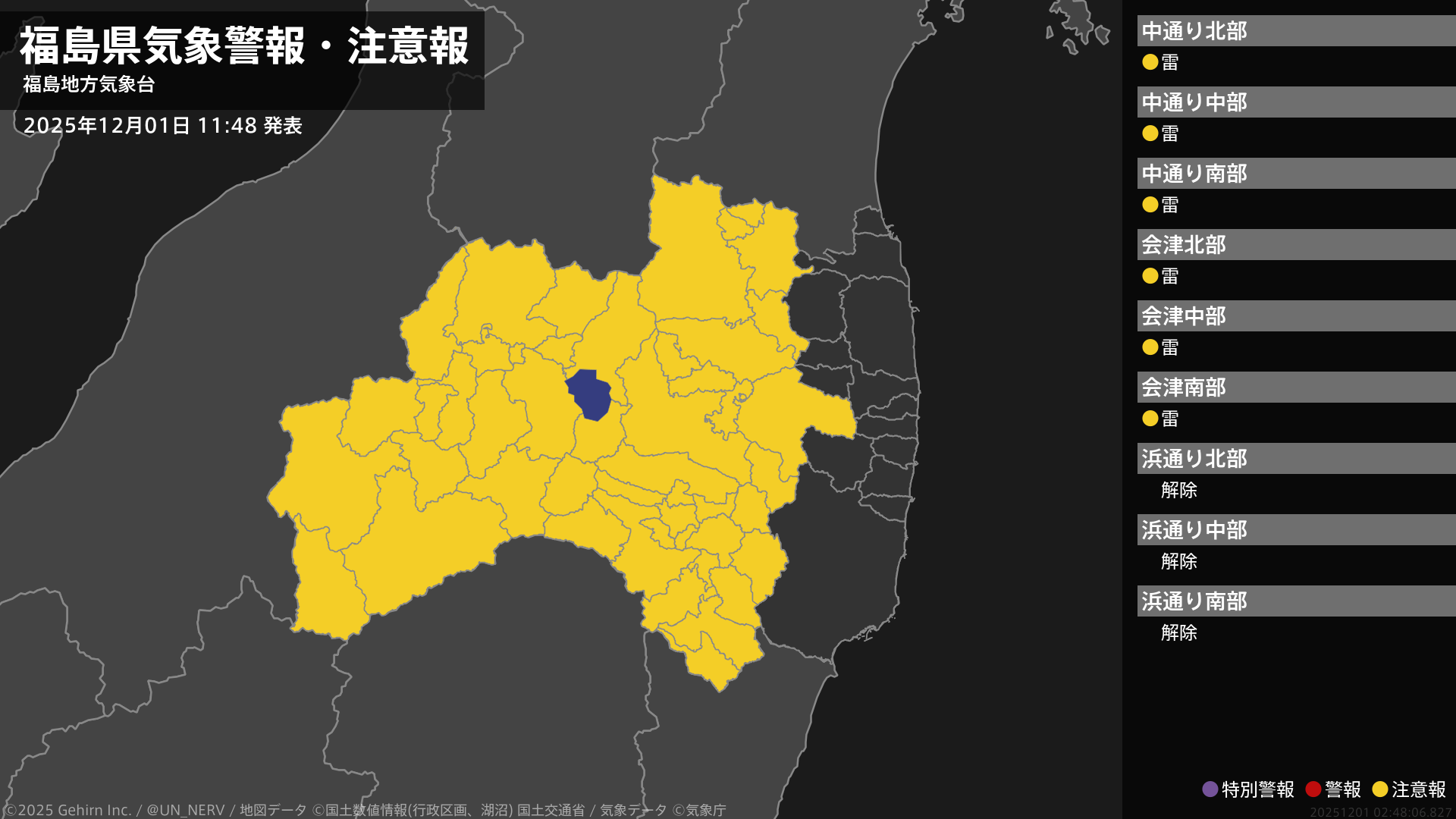 【福島県 気象警報・注意報 2025年12月01日 11:48】中通り、会津では、1日昼過ぎから1日夕方まで急な強い雨や落雷に注意してください。#気象警報注意報 #福島県