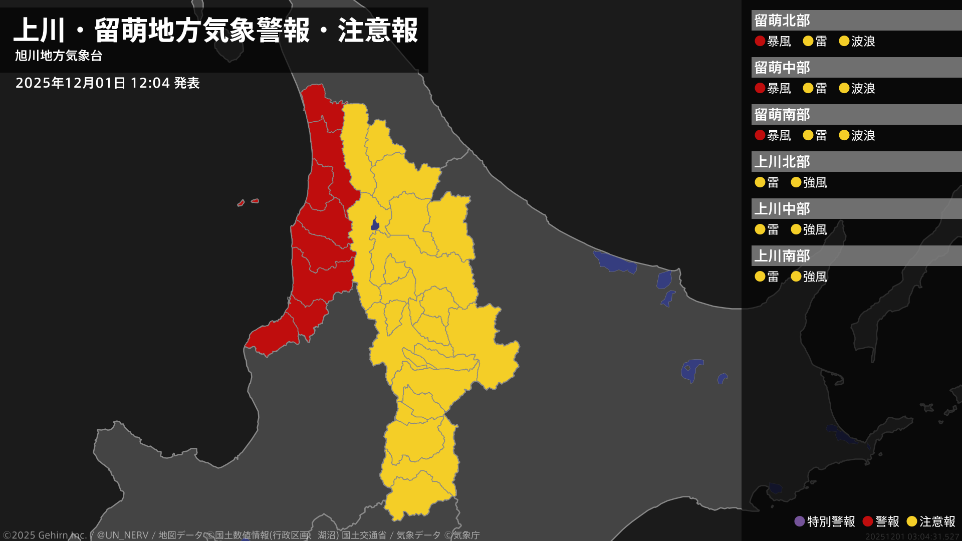 【上川・留萌地方 気象警報・注意報 2025年12月01日 12:04】留萌地方では、1日夕方まで暴風に警戒してください。#気象警報注意報 #上川地方 #留萌地方