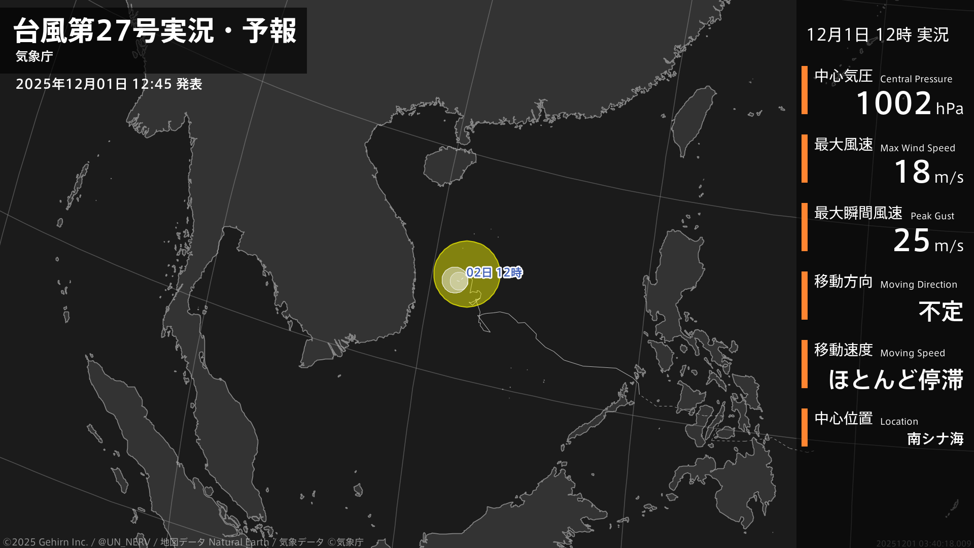 【台風第27号実況・予報 2025年12月01日 12:40】台風第27号(コト)は、南シナ海でほとんど停滞しています。#台風情報