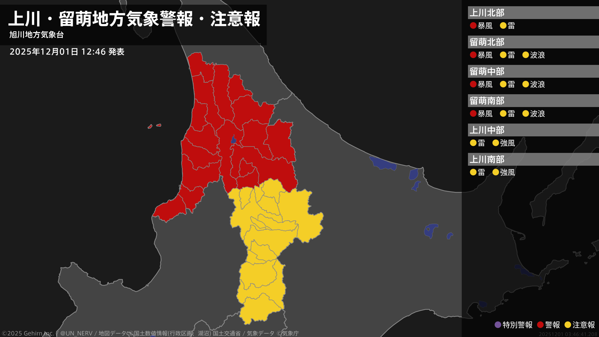 【上川・留萌地方 気象警報・注意報 2025年12月01日 12:46】上川、留萌地方では、1日夕方まで暴風に警戒してください。#気象警報注意報 #上川地方 #留萌地方