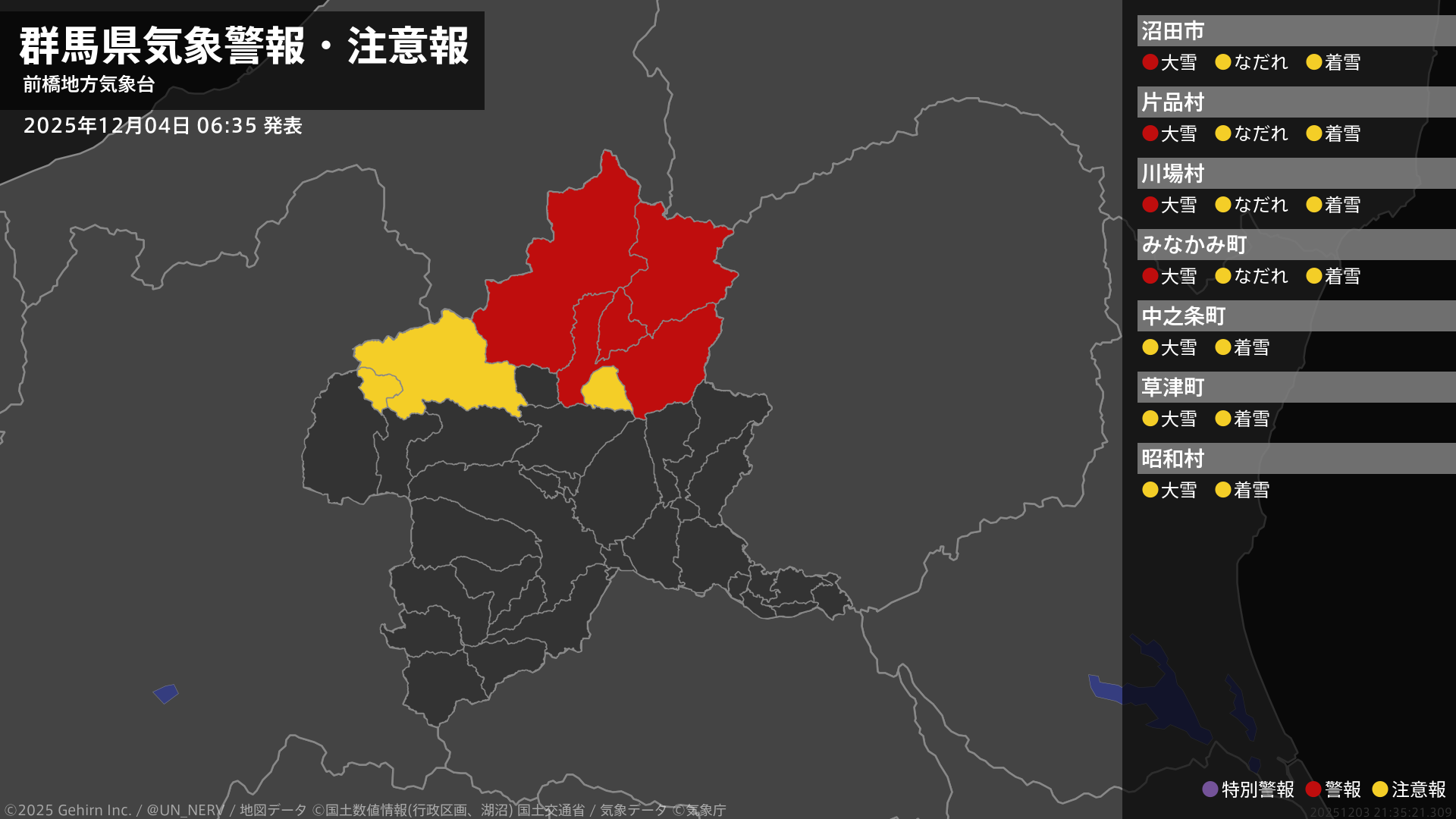 【群馬県 気象警報・注意報 2025年12月04日 06:35】北部では、4日朝まで大雪に警戒してください。#気象警報注意報 #群馬県