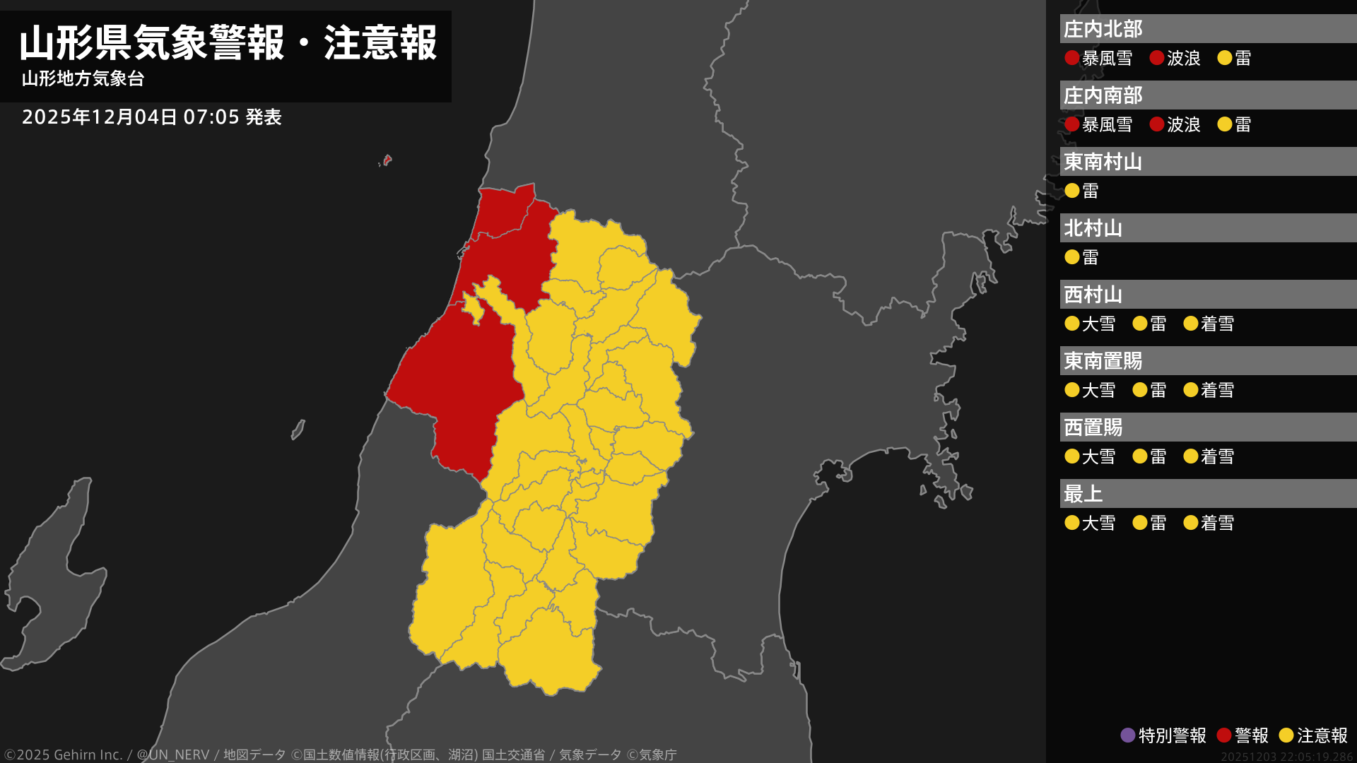 【山形県 気象警報・注意報 2025年12月04日 07:05】山形県の海上では、4日朝まで暴風雪に警戒してください。庄内では、4日朝まで高波に警戒してください。#気象警報注意報 #山形県