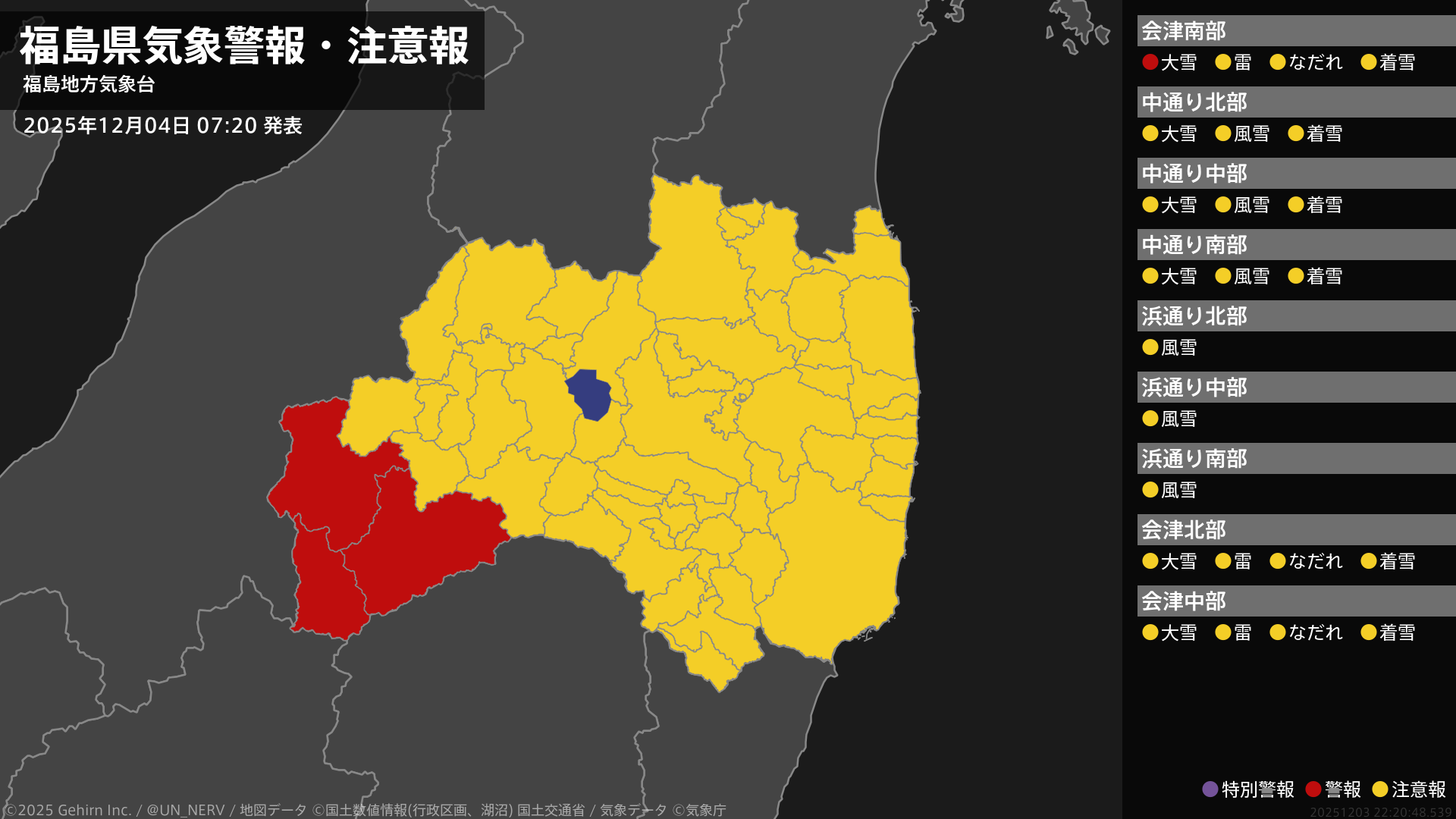 【福島県 気象警報・注意報 2025年12月04日 06:43】中通り、浜通りでは、風雪に注意してください。中通り、会津では、大雪や電線等への着雪に注意してください。会津では、落雷やなだれに注意してください。#気象警報注意報 #福島県