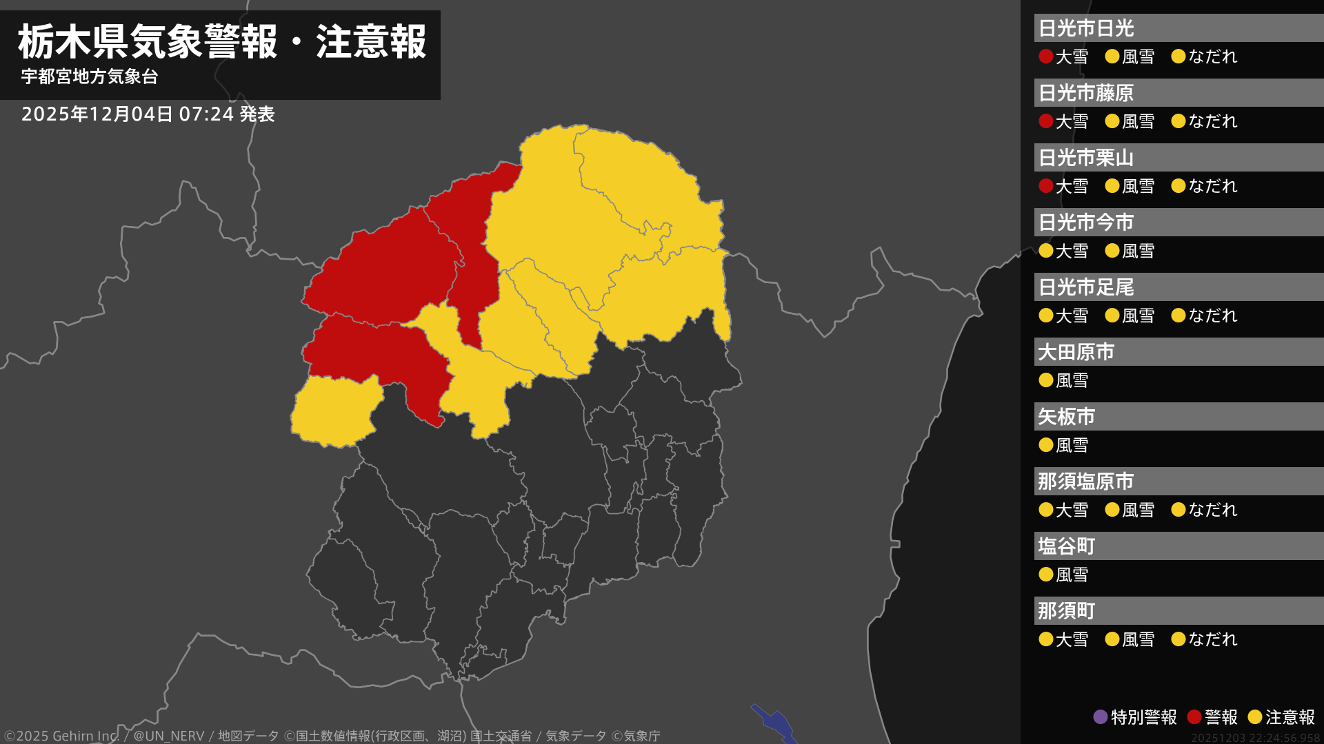 【栃木県 気象警報・注意報 2025年12月04日 07:24】北部では、4日昼前まで大雪に警戒してください。#気象警報注意報 #栃木県