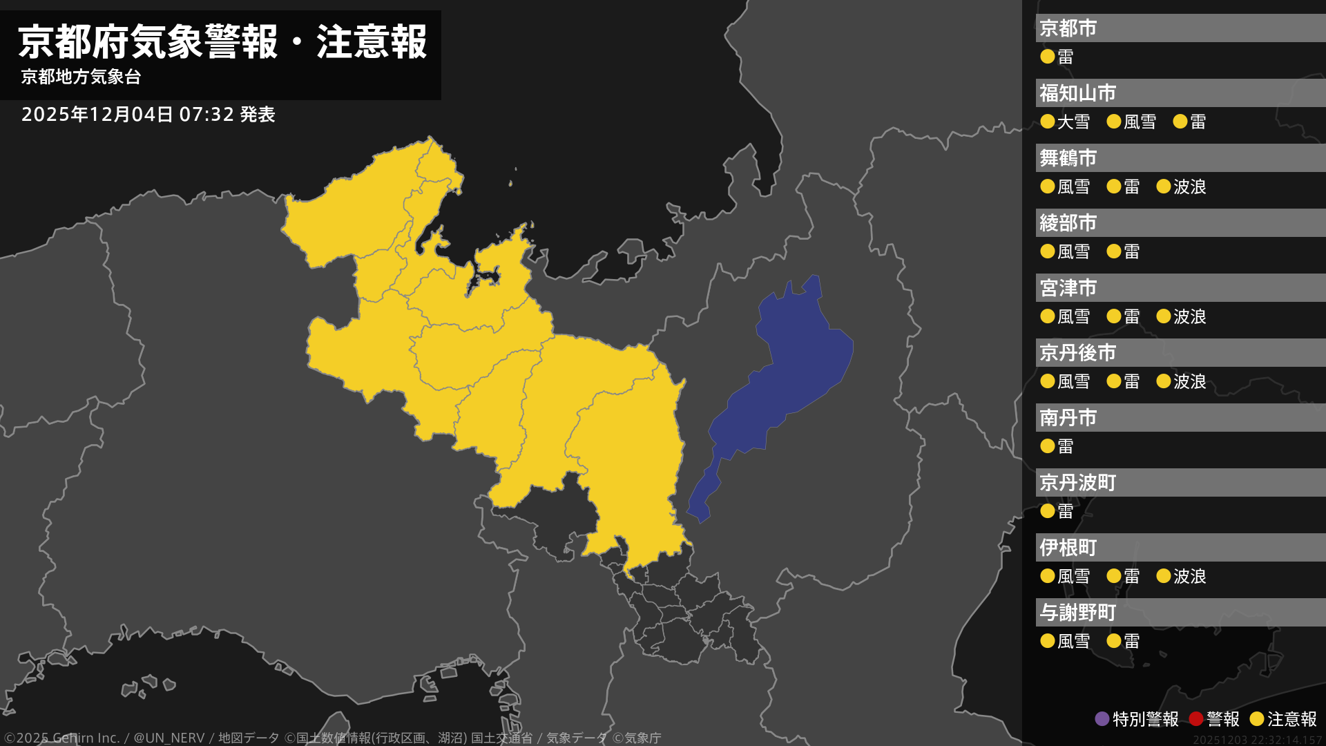 【京都府 気象警報・注意報 2025年12月04日 07:32】北部では、風雪や大雪、高波に注意してください。京都府では、落雷に注意してください。#気象警報注意報 #京都府