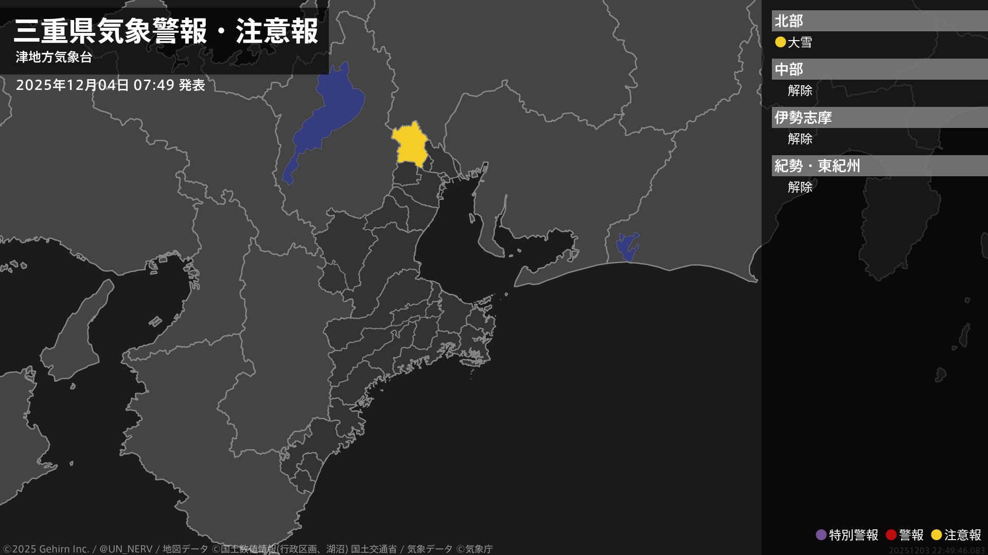 【三重県 気象警報・注意報 2025年12月04日 07:49】北中部では、4日昼前まで大雪に注意してください。#気象警報注意報 #三重県