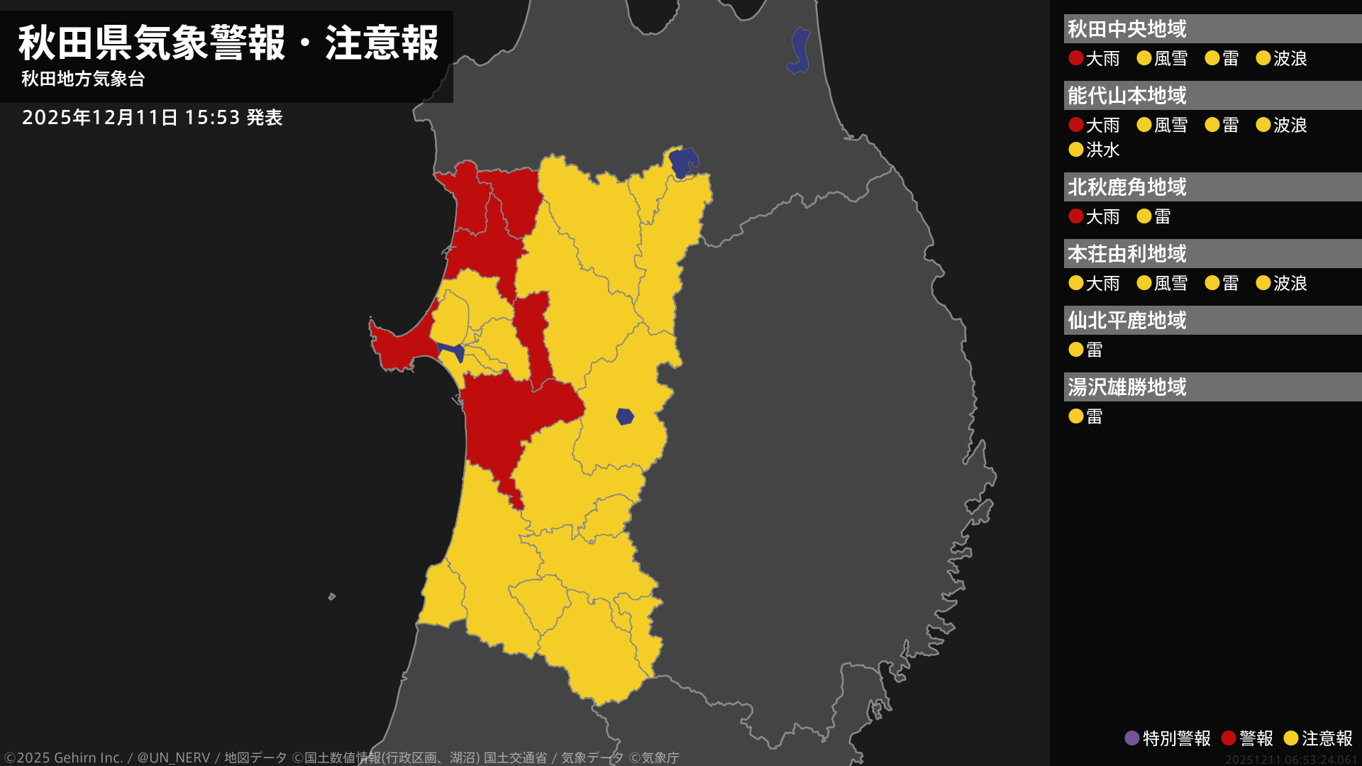 【秋田県 気象警報・注意報 2025年12月11日 15:53】秋田県では、11日夜遅くまで土砂災害に警戒してください。#気象警報注意報 #秋田県