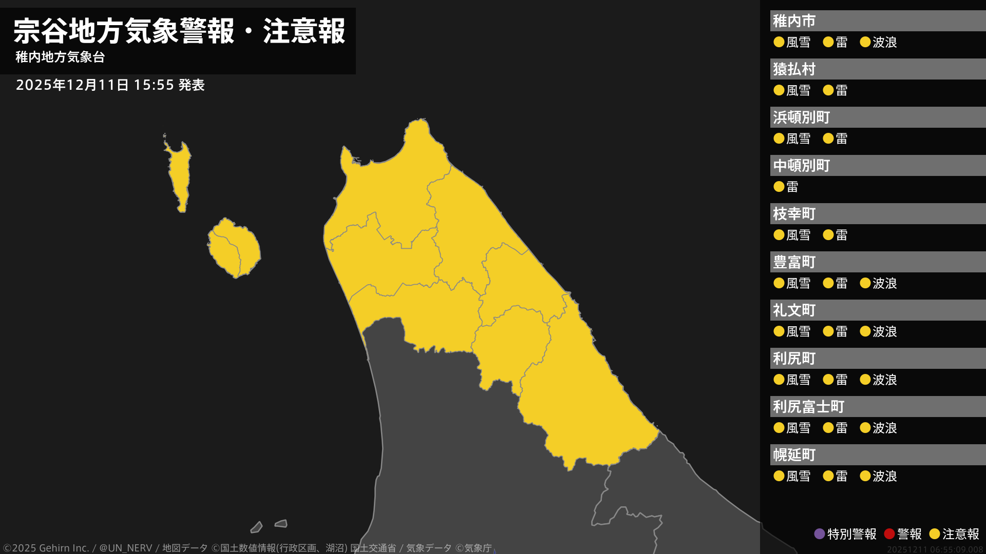 【宗谷地方 気象警報・注意報 2025年12月11日 15:55】宗谷地方では、11日夜のはじめ頃から風雪に、12日明け方から高波に、11日夜遅くから12日夕方まで落雷に注意してください。#気象警報注意報 #宗谷地方