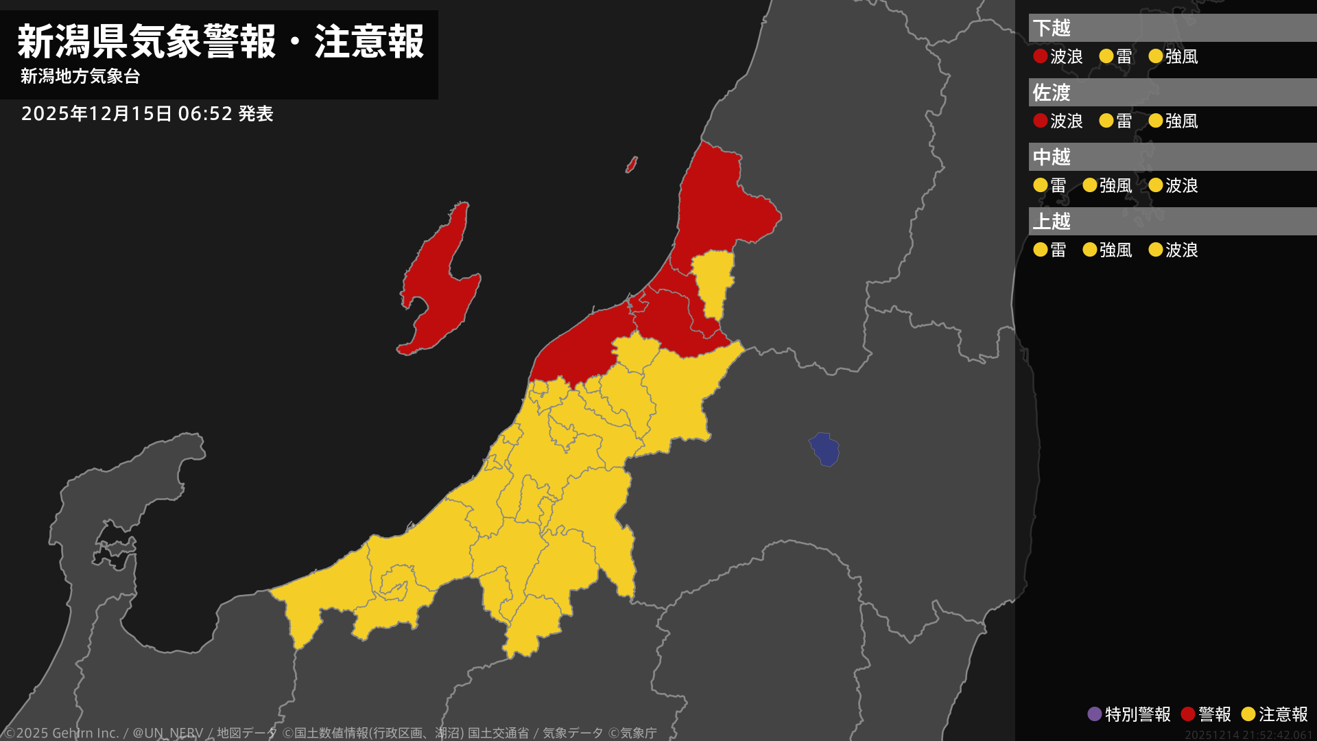 【新潟県 気象警報・注意報 2025年12月15日 06:52】下越、佐渡では、15日昼過ぎまで高波に警戒してください。#気象警報注意報 #新潟県