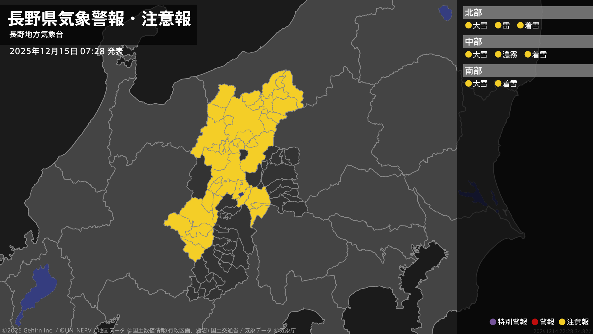 【長野県 気象警報・注意報 2025年12月15日 07:28】長野県では、15日昼前まで大雪や電線等への着雪に注意してください。北部では、15日昼前まで落雷に注意してください。中部では、15日昼前まで濃霧による視程障害に注意してください。#気象警報注意報 #長野県