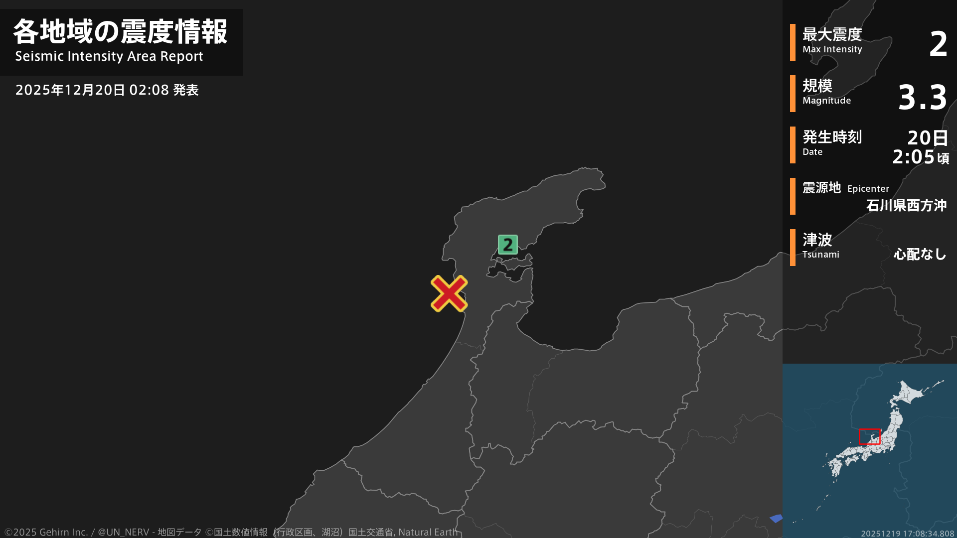 21時54分頃、八丈島東方沖を震源とする地震がありました。地震の規模はM4.5程度、最大震度2程度と推定されています。この情報は気象庁の予報に基づく推定です。情報は誤差を含む場合があります。