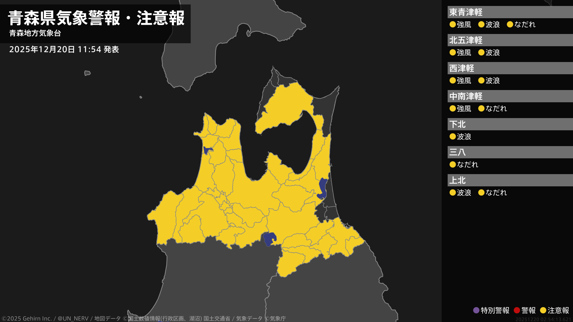 【青森県 気象警報・注意報 2025年12月20日 11:54】津軽では、21日昼前まで強風に注意してください。青森県では、21日昼前まで高波に注意してください。津軽、三八上北では、21日までなだれに注意してください。#気象警報注意報 #青森県