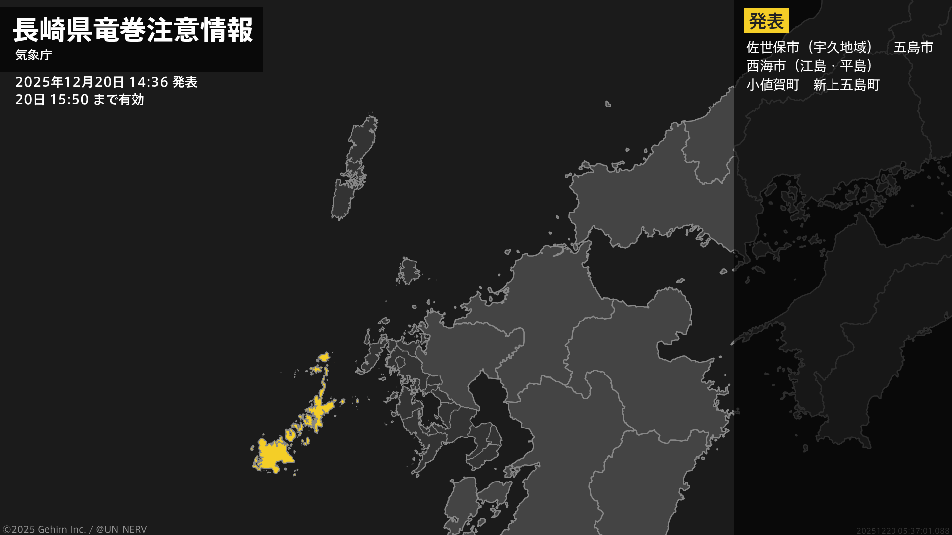 【長崎県 竜巻注意情報】長崎県は、竜巻などの激しい突風が発生しやすい気象状況になっています。頑丈な建物内に移動するなど安全確保に努めてください。この情報は20日15:50まで有効です。#竜巻注意情報 #長崎県