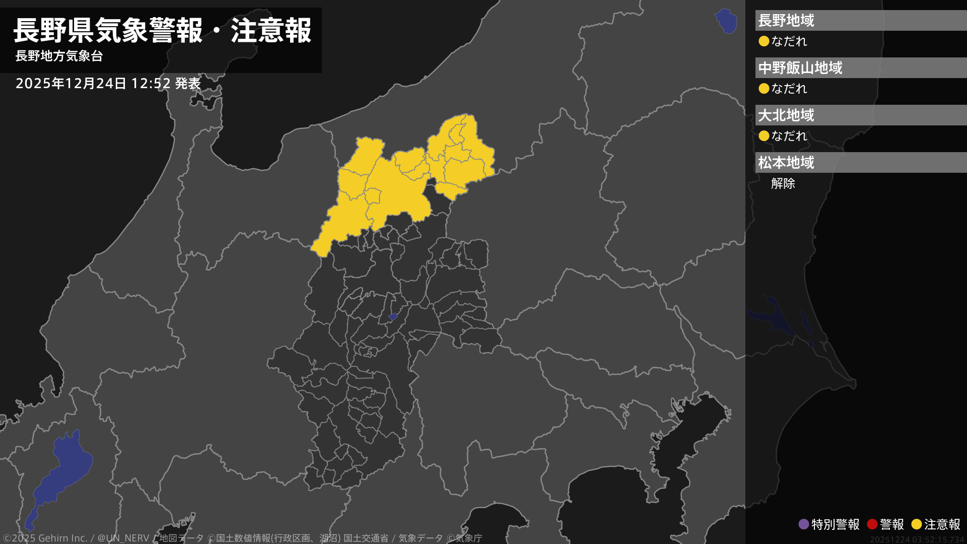 【長野県 気象警報・注意報 2025年12月24日 12:52】北部では、25日までなだれに注意してください。#気象警報注意報 #長野県