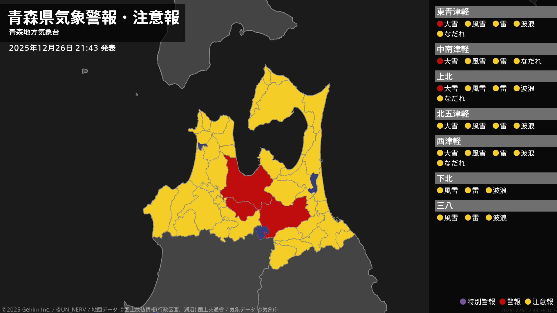 【青森県 気象警報・注意報 2025年12月26日 21:43】津軽、三八上北では、27日明け方まで大雪に警戒してください。#気象警報注意報 #青森県