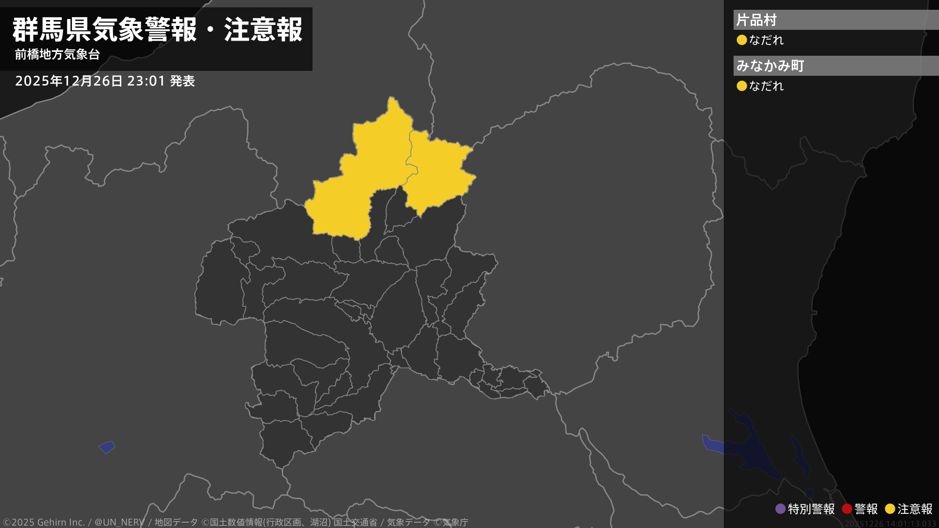 【群馬県 気象警報・注意報 2025年12月26日 23:01】北部では、27日までなだれに注意してください。#気象警報注意報 #群馬県