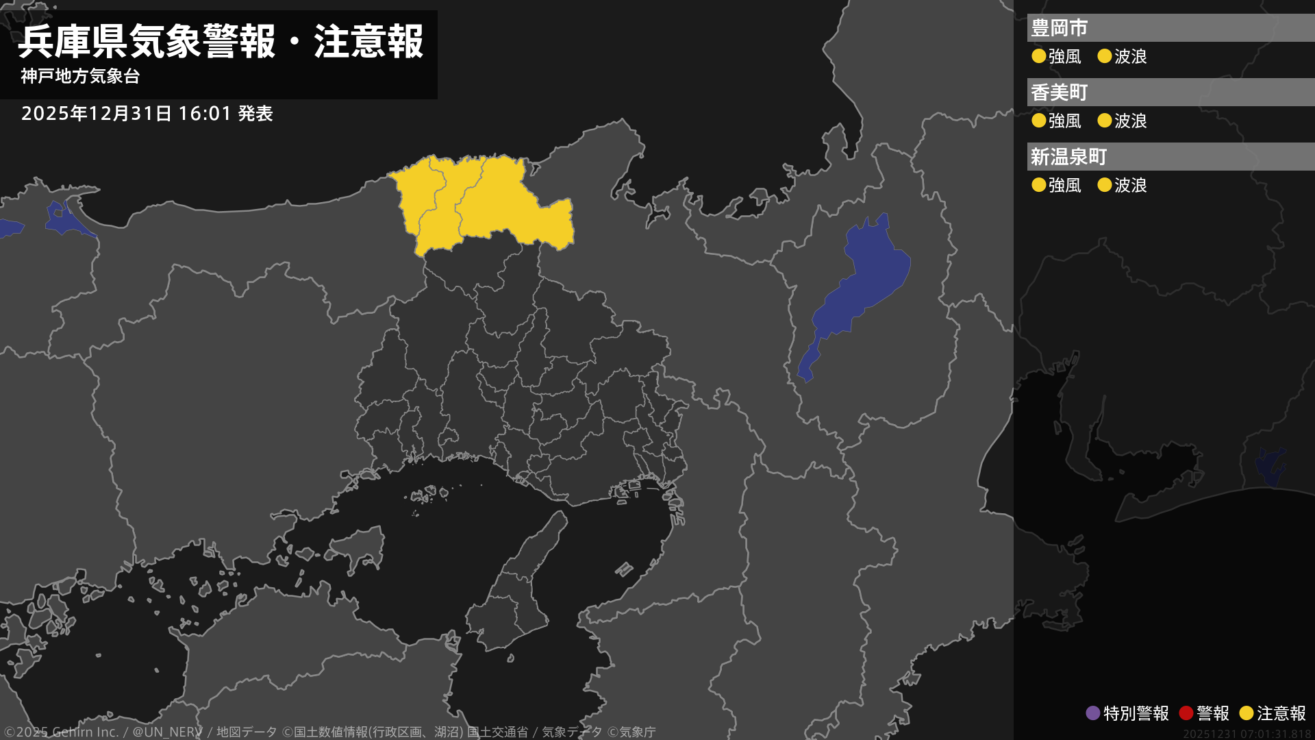 【兵庫県 気象警報・注意報 2025年12月31日 16:01】