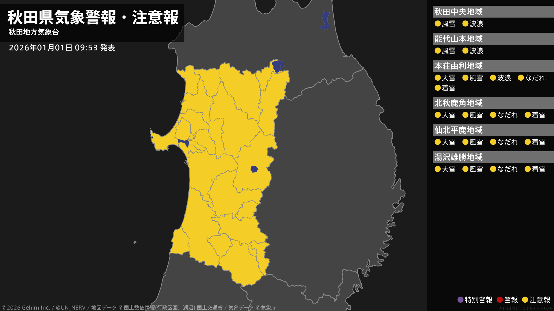【秋田県 気象警報・注意報 2026年01月01日 09:53】内陸では1日夕方まで、沿岸では1日夜遅くまで、風雪に注意してください。秋田県では、1日夕方まで大雪や電線等への着雪に、2日昼前まで高波に、1日までなだれに注意してください。#気象警報注意報 #秋田県