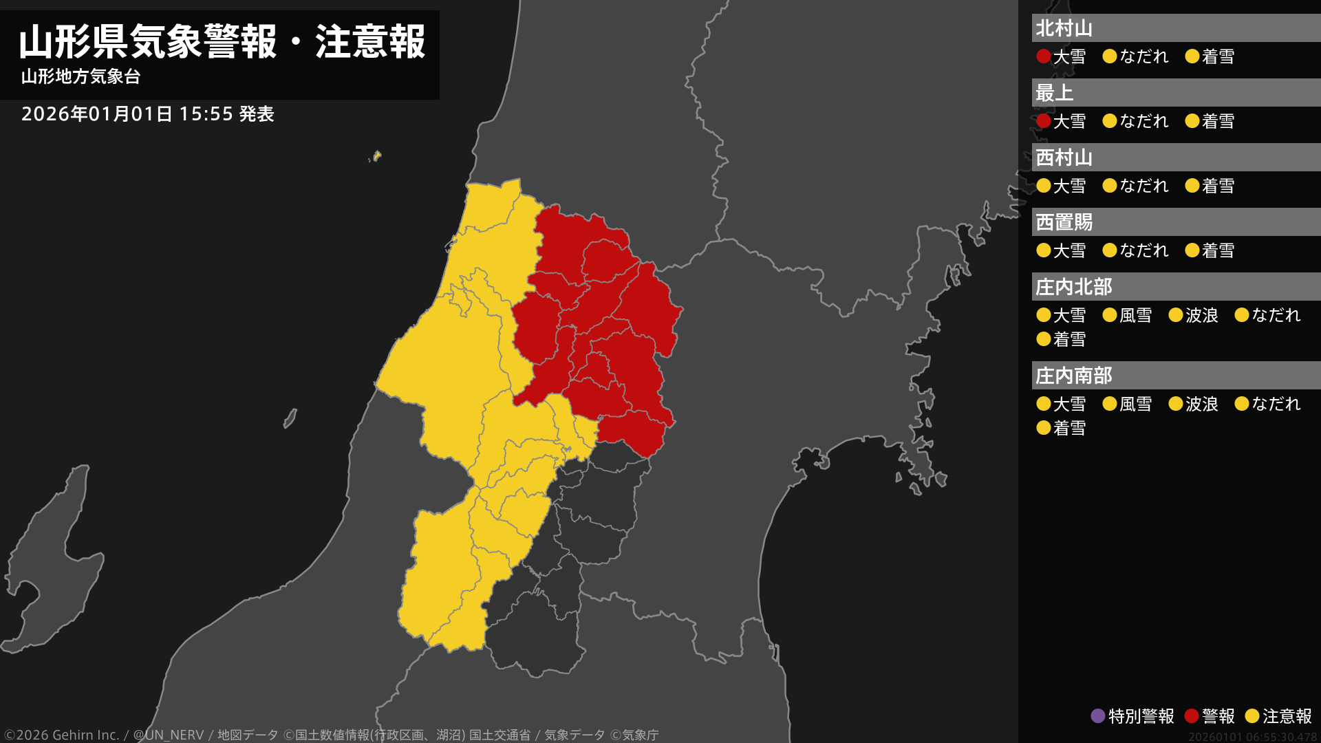 【山形県 気象警報・注意報 2026年01月01日 15:55】村山、最上では、1日夜遅くまで大雪に警戒してください。#気象警報注意報 #山形県