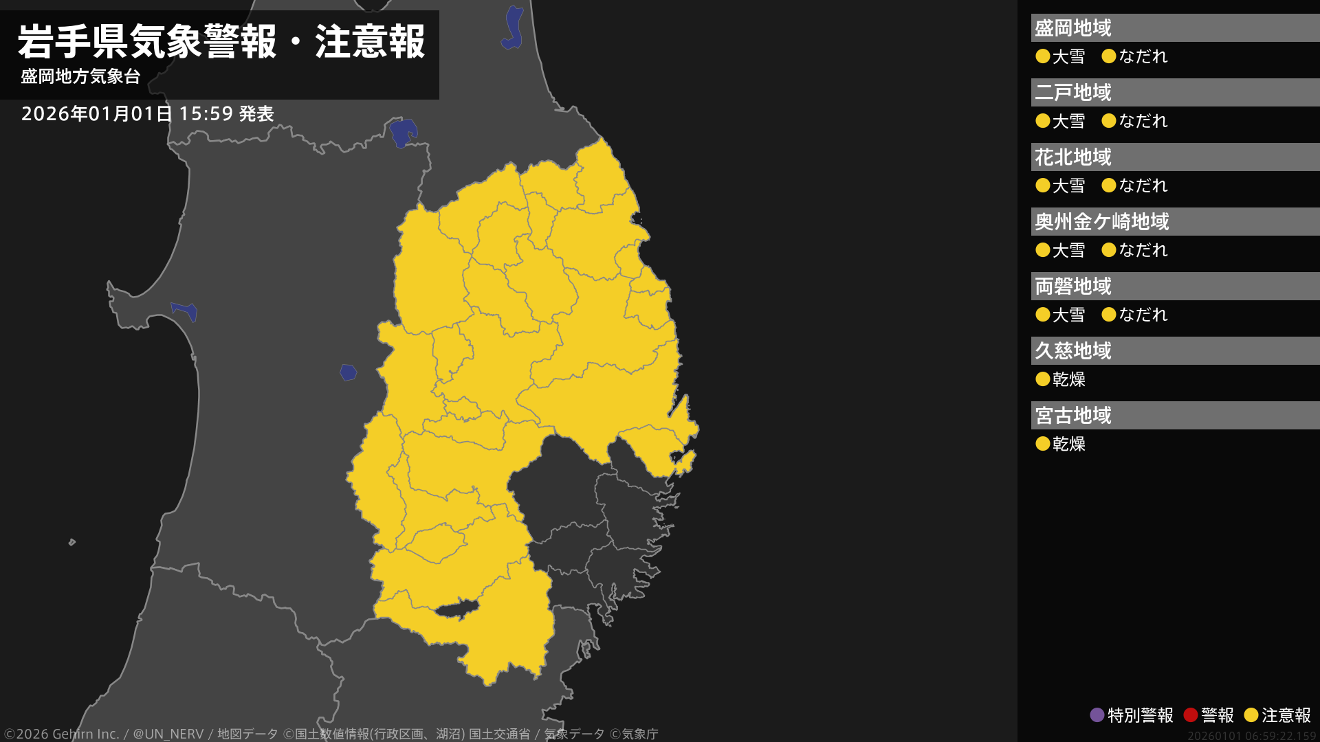 【岩手県 気象警報・注意報 2026年01月01日 15:59】内陸では、1日夜遅くまで大雪に、2日までなだれに注意してください。沿岸北部では、3日まで空気の乾燥した状態が続くため、火の取り扱いに注意してください。#気象警報注意報 #岩手県