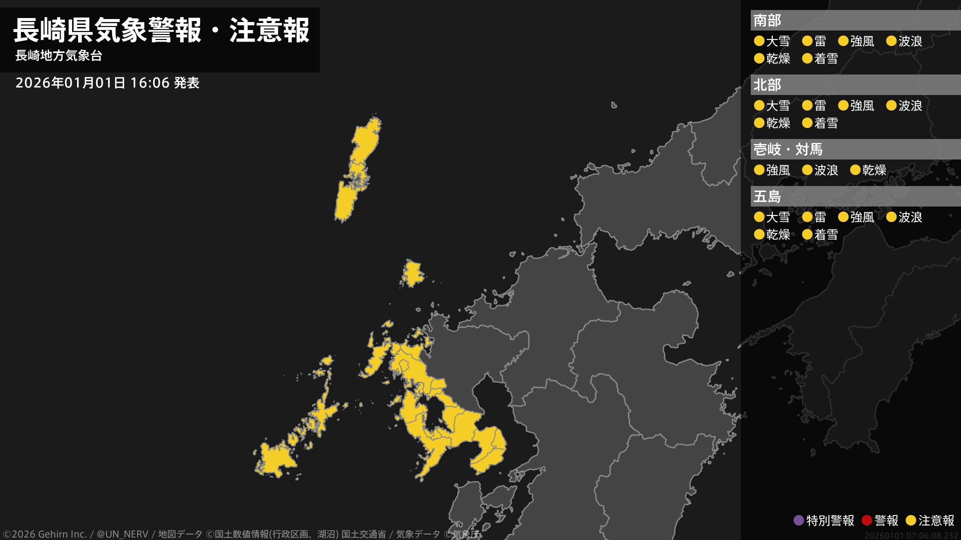【長崎県 気象警報・注意報 2026年01月01日 16:06】長崎県では、強風や高波と、空気の乾燥した状態が続くため火の取り扱いに注意してください。南部、北部、五島では、大雪や落雷、電線等への着雪に注意してください。#気象警報注意報 #長崎県
