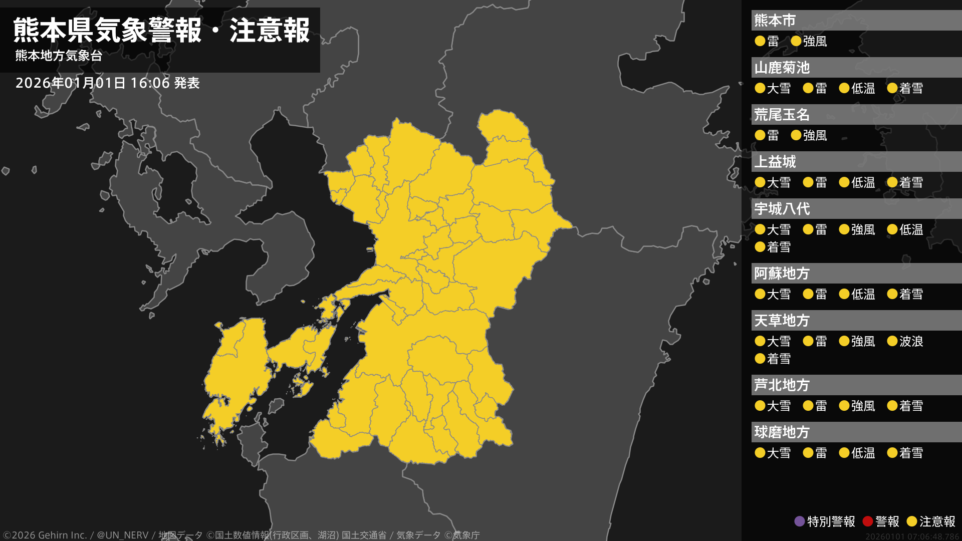 【熊本県 気象警報・注意報 2026年01月01日 16:06】熊本、天草・芦北地方では強風に、熊本県では大雪や落雷、電線等への着雪に、天草・芦北地方では高波に、熊本、阿蘇、球磨地方では低温に注意してください。#気象警報注意報 #熊本県