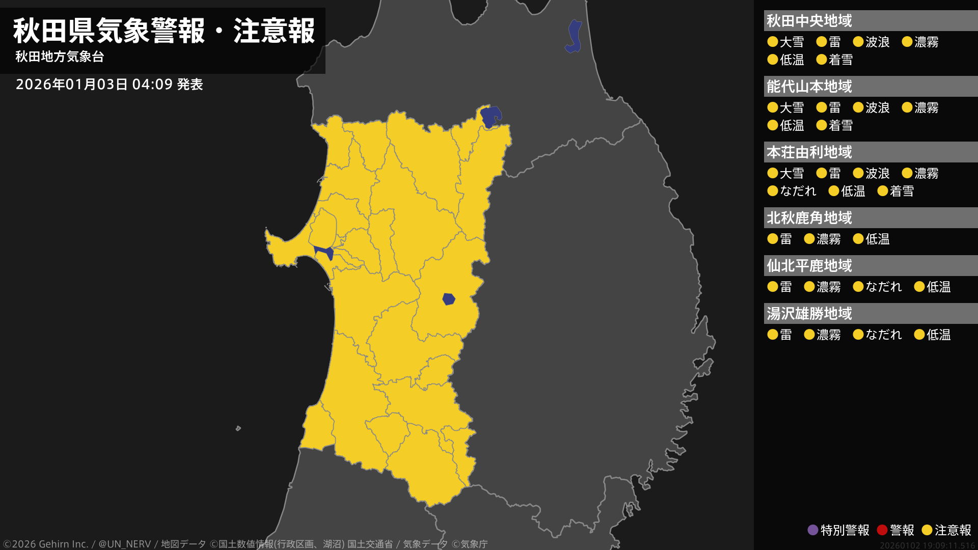 【秋田県 気象警報・注意報 2026年01月03日 04:09】沿岸では、大雪や高波、電線等への着雪に注意してください。秋田県では、落雷や濃霧による視程障害、なだれ、低温に注意してください。#気象警報注意報 #秋田県