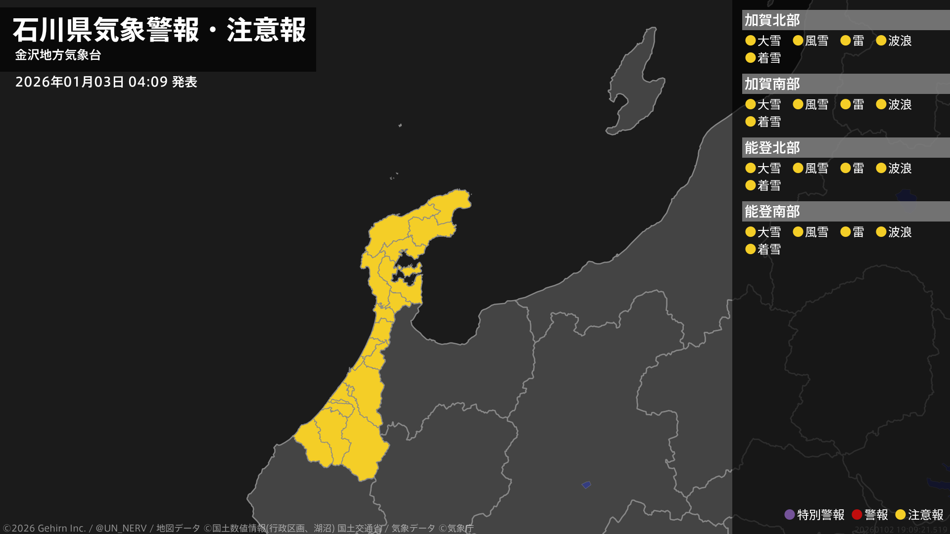 【石川県 気象警報・注意報 2026年01月03日 04:09】石川県では、風雪や大雪、高波、落雷、電線等への着雪に注意してください。#気象警報注意報 #石川県