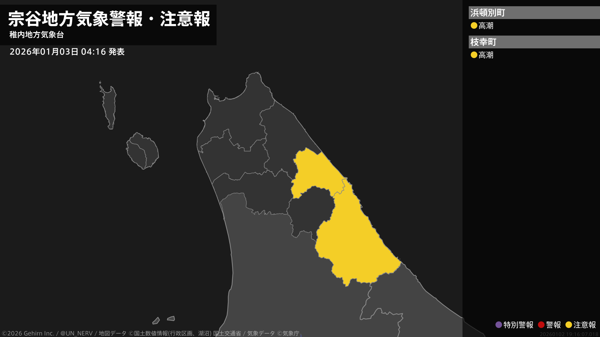【宗谷地方 気象警報・注意報 2026年01月03日 04:16】宗谷地方では、3日昼前から3日夕方まで高潮に注意してください。#気象警報注意報 #宗谷地方