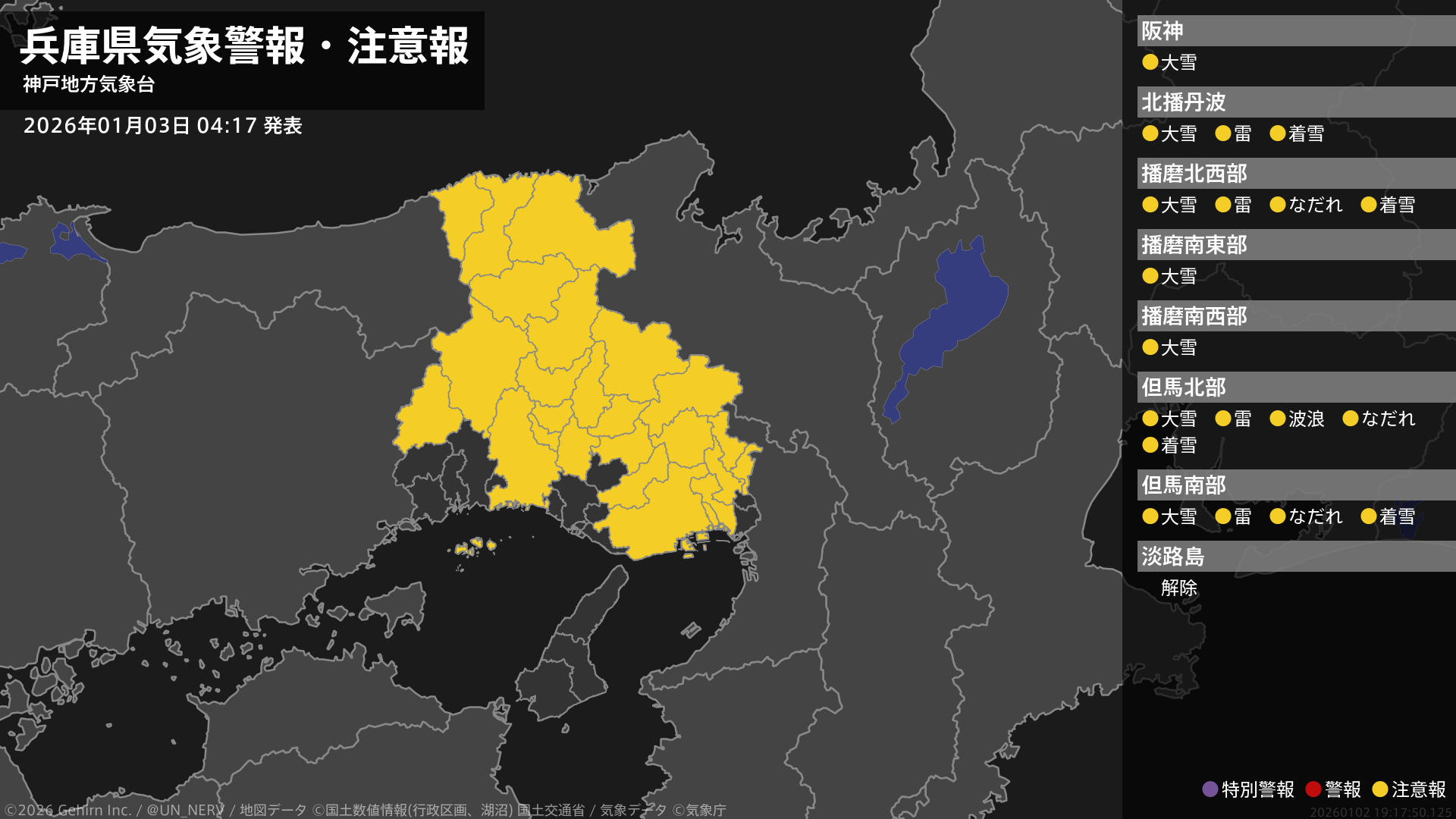 【兵庫県 気象警報・注意報 2026年01月03日 04:17】兵庫県では、3日昼前まで大雪や電線等への着雪に、3日夜遅くまで落雷に、4日までなだれに注意してください。北部では、3日夜遅くまで高波に注意してください。#気象警報注意報 #兵庫県