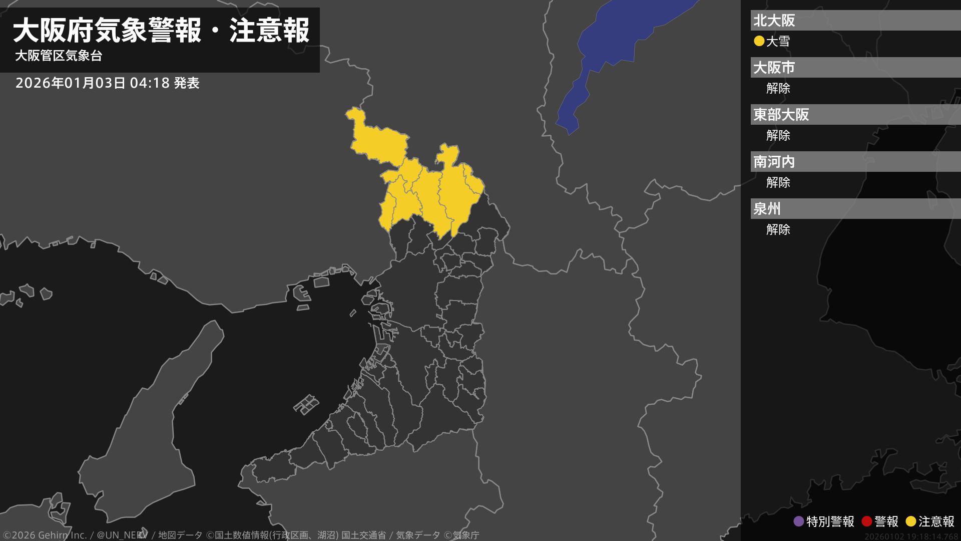 【大阪府 気象警報・注意報 2026年01月03日 04:18】大阪府では、3日昼前まで大雪に注意してください。#気象警報注意報 #大阪府