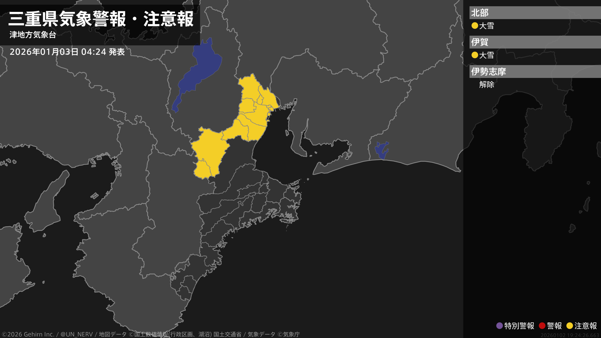 【三重県 気象警報・注意報 2026年01月03日 04:24】北中部では、3日昼前まで大雪に注意してください。#気象警報注意報 #三重県