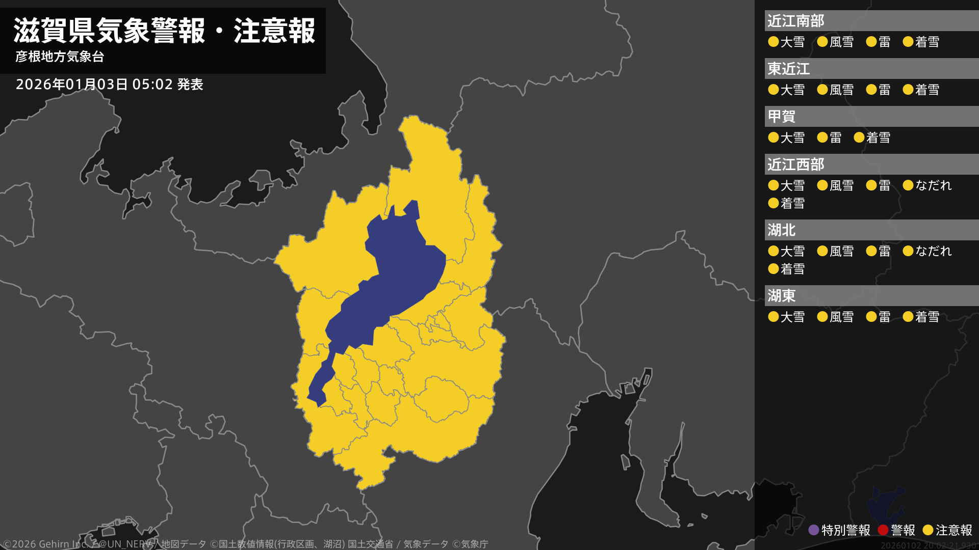 【滋賀県 気象警報・注意報 2026年01月03日 05:02】滋賀県では、3日昼前まで風雪や大雪、電線等への着雪に、3日夜遅くまで落雷に注意してください。北部では、3日までなだれに注意してください。#気象警報注意報 #滋賀県