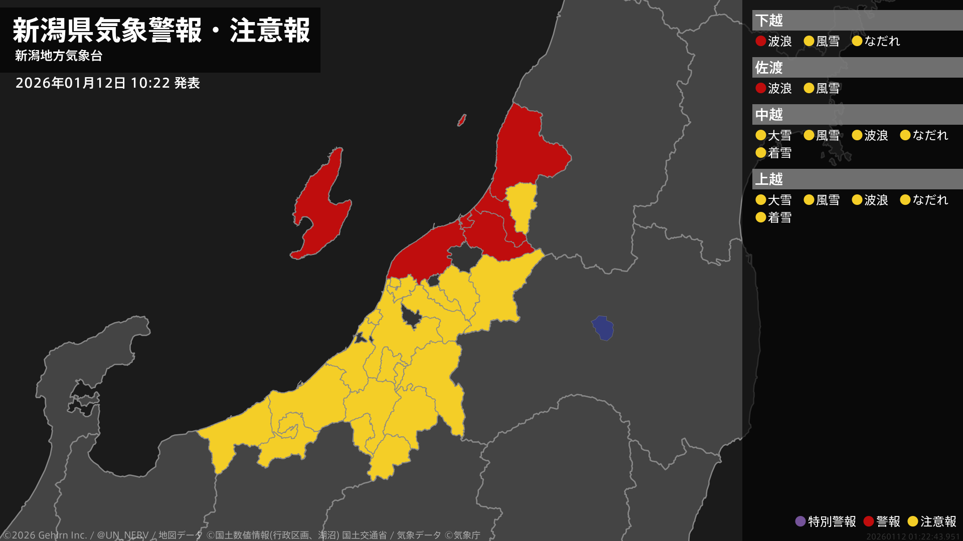 【新潟県 気象警報・注意報 2026年01月12日 10:22】下越、佐渡では、12日昼過ぎまで高波に警戒してください。#気象警報注意報 #新潟県