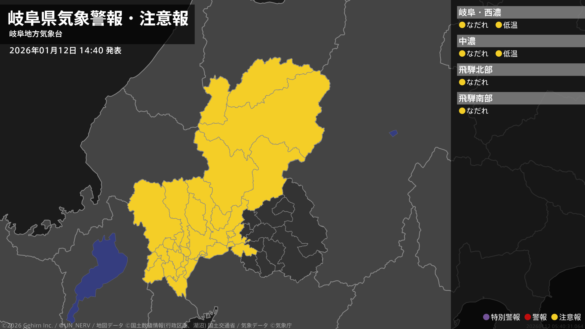 【岐阜県 気象警報・注意報 2026年01月12日 14:40】岐阜県では、14日までなだれに注意してください。美濃地方では、13日まで低温に注意してください。#気象警報注意報 #岐阜県