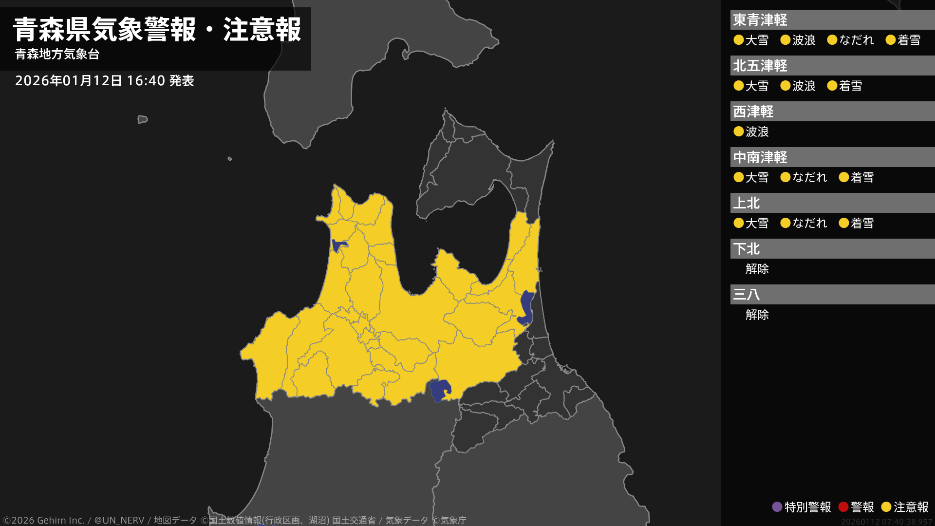 【青森県 気象警報・注意報 2026年01月12日 16:40】津軽、三八上北では、大雪やなだれ、電線等への着雪に注意してください。津軽では、高波に注意してください。#気象警報注意報 #青森県