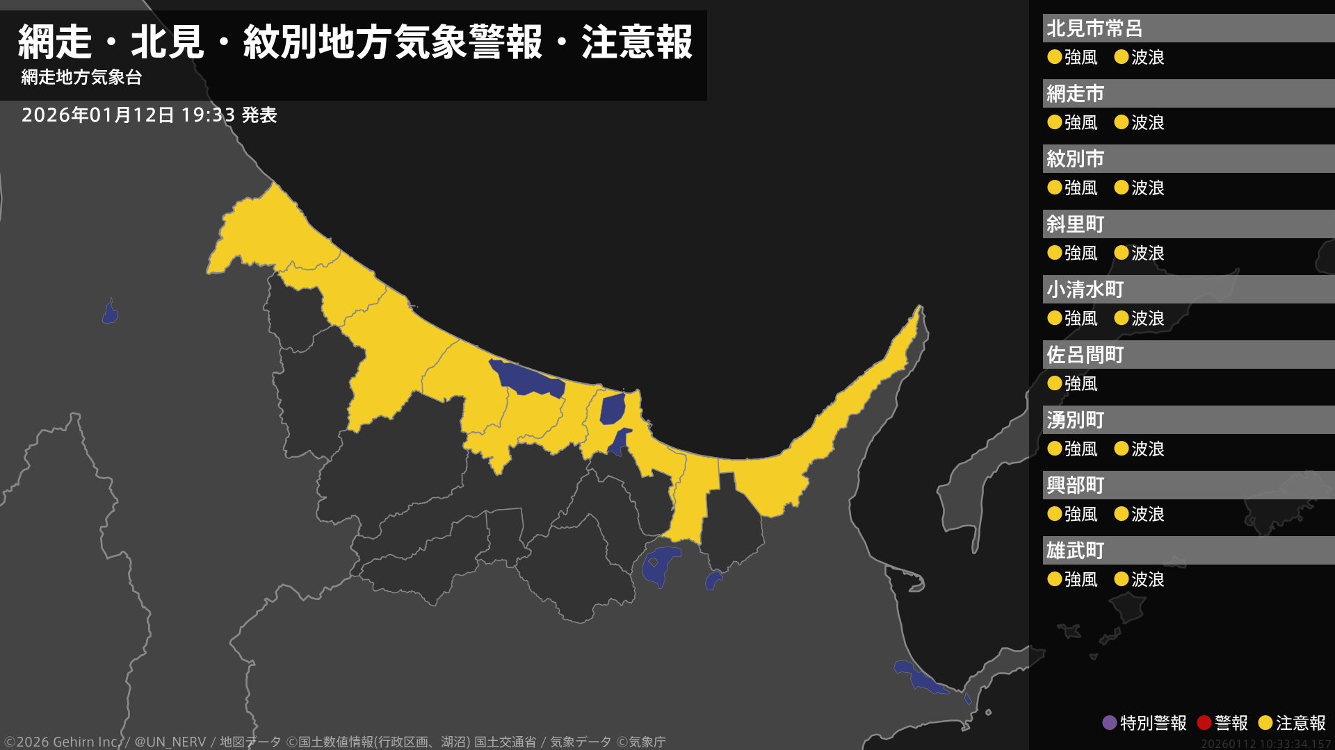 【網走・北見・紋別地方 気象警報・注意報 2026年01月12日 19:33】網走、紋別地方では、13日明け方まで強風や高波に注意してください。#気象警報注意報 #網走・北見・紋別地方