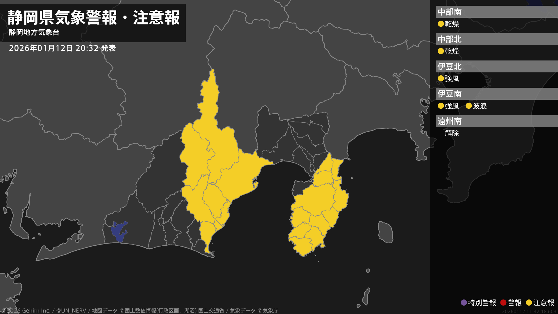 【静岡県 気象警報・注意報 2026年01月12日 20:32】伊豆では、強風や高波に注意してください。中部では、空気の乾燥した状態が続くため、火の取り扱いに注意してください。#気象警報注意報 #静岡県